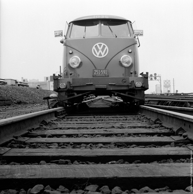 Esta carrinha dava para tudo ou não fosse VW (da velha guarda). Veículo versátil. Esta versão tinha dois conjuntos de jantes e pneus, nomeadamente para estrada e linhas de comboio. Esta fotografia é da autoria de Sherman / Three Lions / Getty Images. Circa 1956.